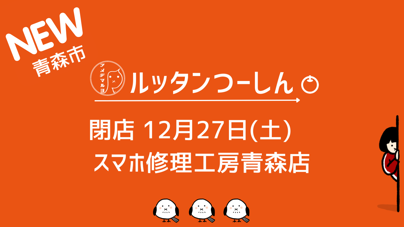 HOME > お知らせ > お知らせ 開店・閉店 😐【閉店】令和7年12月27日(土)スマホ修理工房青森店(青森市) 2025年12月21日 店舗情報 店舗名:スマホ修理工房青森店 閉店日:2025年12月27日(土) 所在地: 〒038-0042 青森県青森市新城平岡252−77 営業時間:ホームページでご確認お願いします。 この投稿をInstagramで見る スマホ修理工房青森店(@sumahosyurikoboaomori)がシェアした投稿 Post この記事を書いた人 最新記事 ルッタンつーしん 『ルッタンつーしん』は、津軽地方の魅力や情報を、都会に住む津軽出身者や津軽に関心を持つ方々に届けるwebサイトです。 ルッタンの独自目線で、地域の最新ニュースやイベント情報、観光スポットの紹介、地元企業の商品やサービスを取り上げ、津軽の魅力を発信します。 2026/01/09⚠️【それいけ!ルッタン津軽弁漫画9】てやてやさんと雪かぎ! 2026/01/08🍎ルッタンの青森ドライブイン飯🍎鶴田町「中華食堂 つるのたまご」 2026/01/08😐【閉店】令和8年1月8日(木)らーめんくまちゃん(弘前市) ルッタンつーしんの記事をもっと見る -お知らせ, 開店・閉店 -閉店, 開店閉店, 青森市