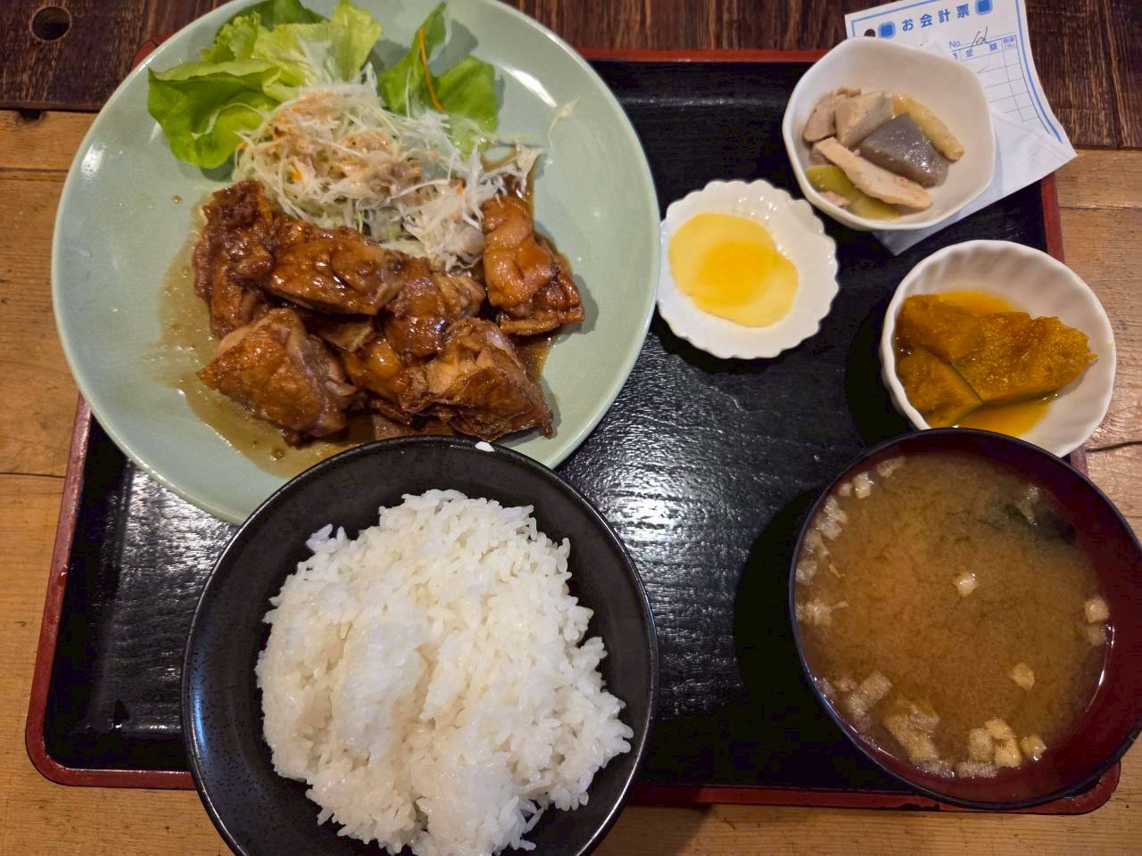 出てきた定食は、鶏肉・ごはん・味噌汁・小鉢・お新香の定番セット。