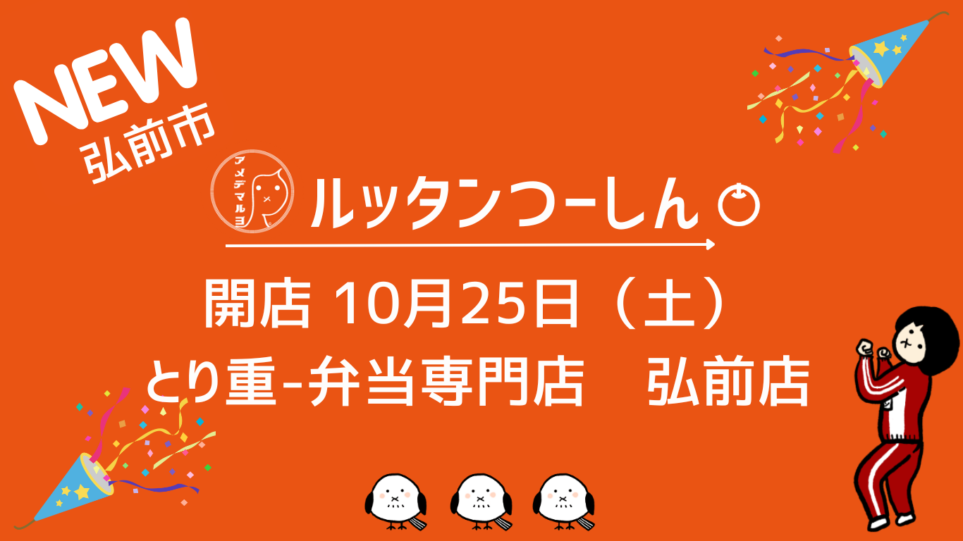 HOME > いぐべし > グルメ > お知らせ グルメ 開店・閉店 🎉【開店】令和7年10月25日(土)とり重-弁当専門店 弘前店(弘前市) 2025年10月26日 お店情報 店舗名:とり重-弁当専門店 弘前店 開店日:令和7年10月25日(土) 所在地: 〒036-8087 弘前市早稲田4-3-17 営業時間:11:00~14:00 17:00~20:00定休日:不定休 この投稿をInstagramで見る とり重専門店-とり源(@torijusennmon_torigen)がシェアした投稿 Post この記事を書いた人 最新記事 ルッタンつーしん 『ルッタンつーしん』は、津軽地方の魅力や情報を、都会に住む津軽出身者や津軽に関心を持つ方々に届けるwebサイトです。 ルッタンの独自目線で、地域の最新ニュースやイベント情報、観光スポットの紹介、地元企業の商品やサービスを取り上げ、津軽の魅力を発信します。 2025/11/19🎉【開店】令和7年11月22日(土)すたみな太郎PREMIUM BUFFET 青森店(青森市) 2025/11/19😐【閉店】令和7年11月18日(火)にこにこ歯科クリニック(青森市) 2025/11/17⚠️【ルッタン津軽弁漫画】かまさねんでけ。 ルッタンつーしんの記事をもっと見る -お知らせ, グルメ, 開店・閉店 -弘前市, 開店, 開店閉店