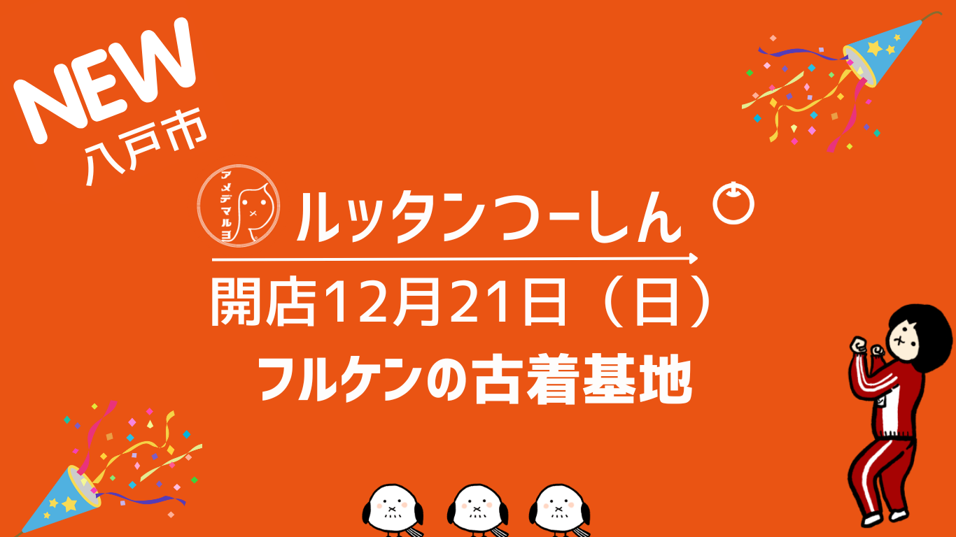 HOME > お知らせ > お知らせ 開店・閉店 🎉【開店】令和7年12月21日(日)フルケンの古着基地(八戸市) 2025年12月21日 店舗情報 店舗名:フルケンの古着基地 開店日:2025年12月21日(日) 所在地: 〒031-0802 青森県八戸市小中野6丁目8−1 第一ライズ A号 営業時間:11:00~20:00定休日:ホームページよりご確認してください。 この投稿をInstagramで見る フルケンの古着基地 @八戸市小中野に12月21日オープン予定!開店準備中!(@furuken_no_furugikichi)がシェアした投稿 Post この記事を書いた人 最新記事 ルッタンつーしん 『ルッタンつーしん』は、津軽地方の魅力や情報を、都会に住む津軽出身者や津軽に関心を持つ方々に届けるwebサイトです。 ルッタンの独自目線で、地域の最新ニュースやイベント情報、観光スポットの紹介、地元企業の商品やサービスを取り上げ、津軽の魅力を発信します。 2026/01/09⚠️【それいけ!ルッタン津軽弁漫画9】てやてやさんと雪かぎ! 2026/01/08🍎ルッタンの青森ドライブイン飯🍎鶴田町「中華食堂 つるのたまご」 2026/01/08😐【閉店】令和8年1月8日(木)らーめんくまちゃん(弘前市) ルッタンつーしんの記事をもっと見る -お知らせ, 開店・閉店 -八戸市, 開店, 開店閉店
